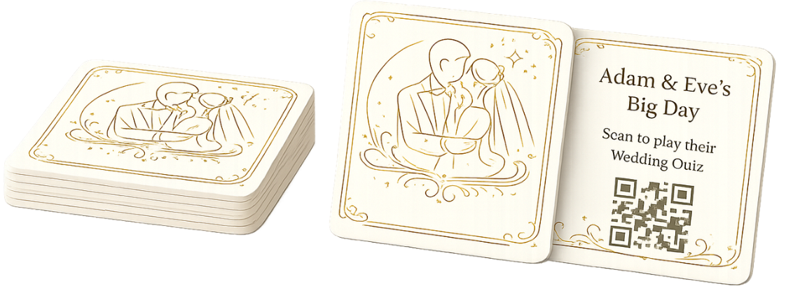 Invite every guest to take part in your story — through beautiful printed coasters that unlock a private wedding celebration built entirely around